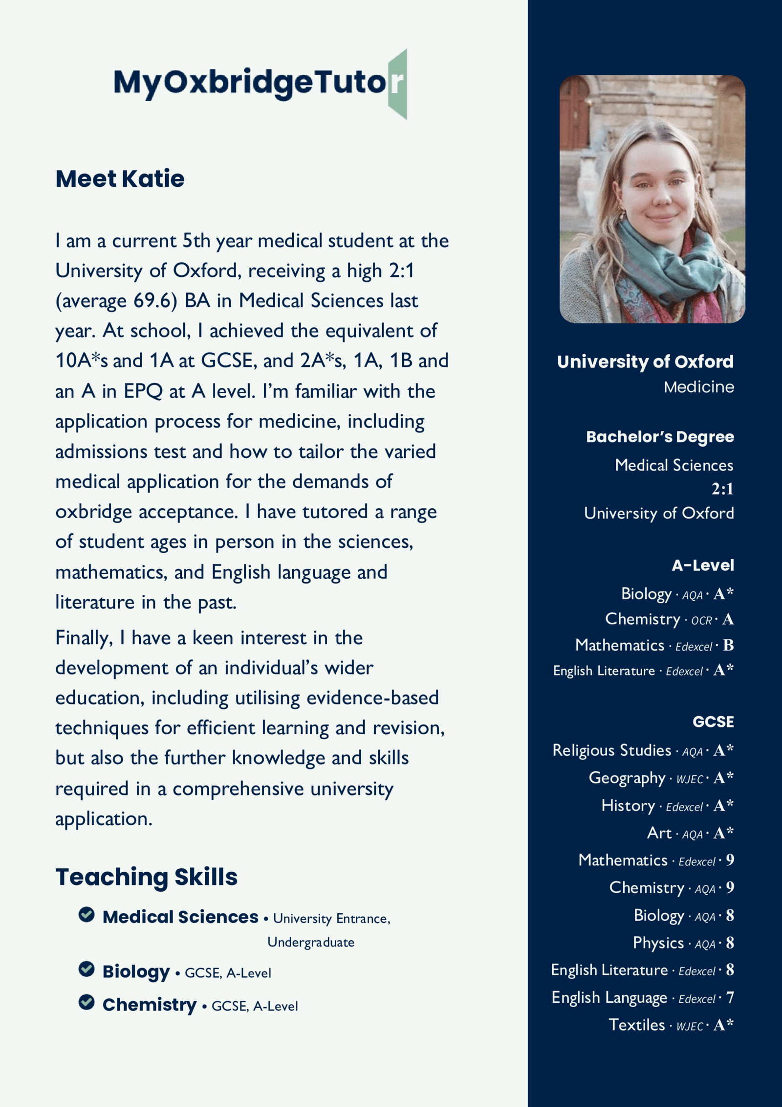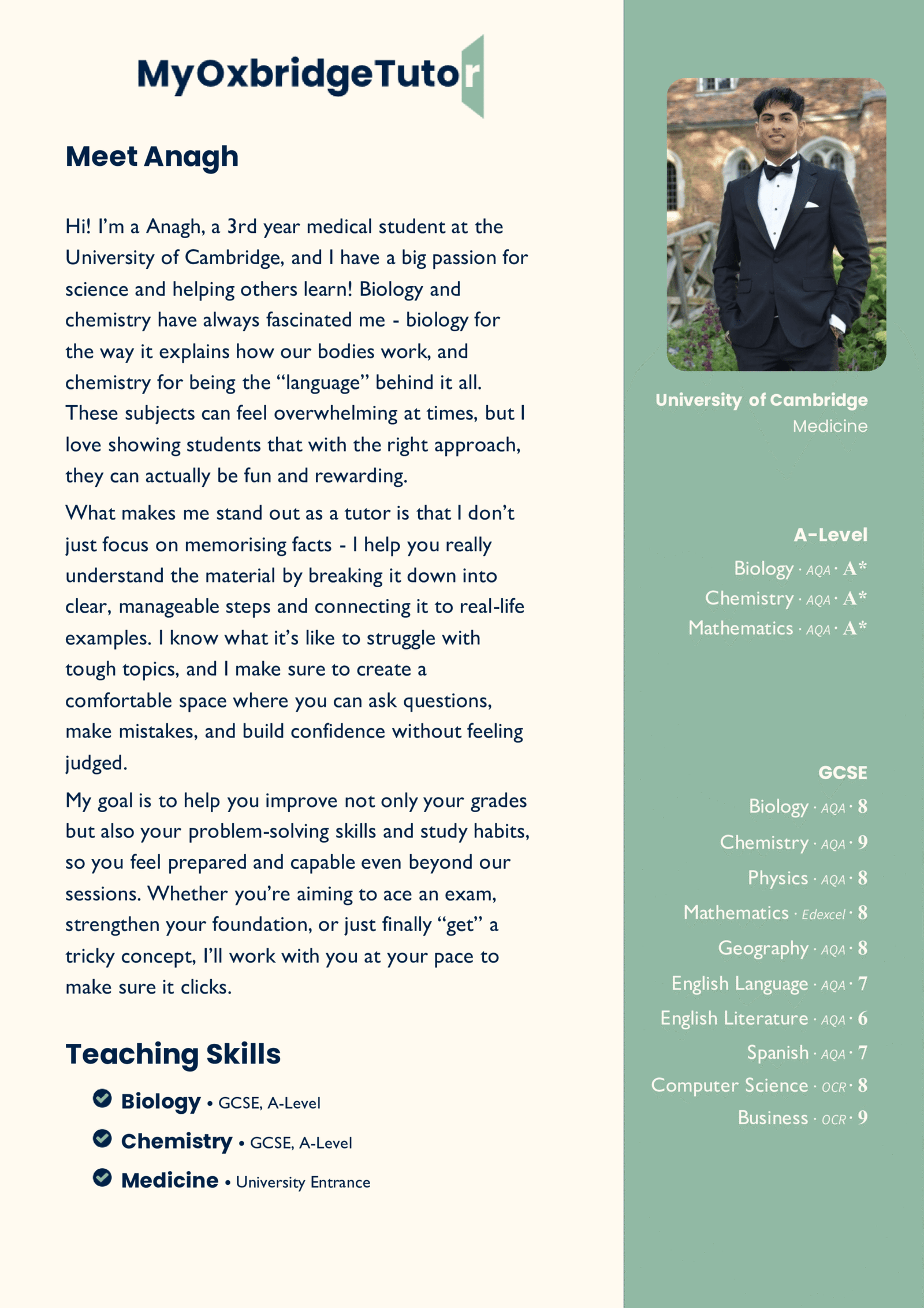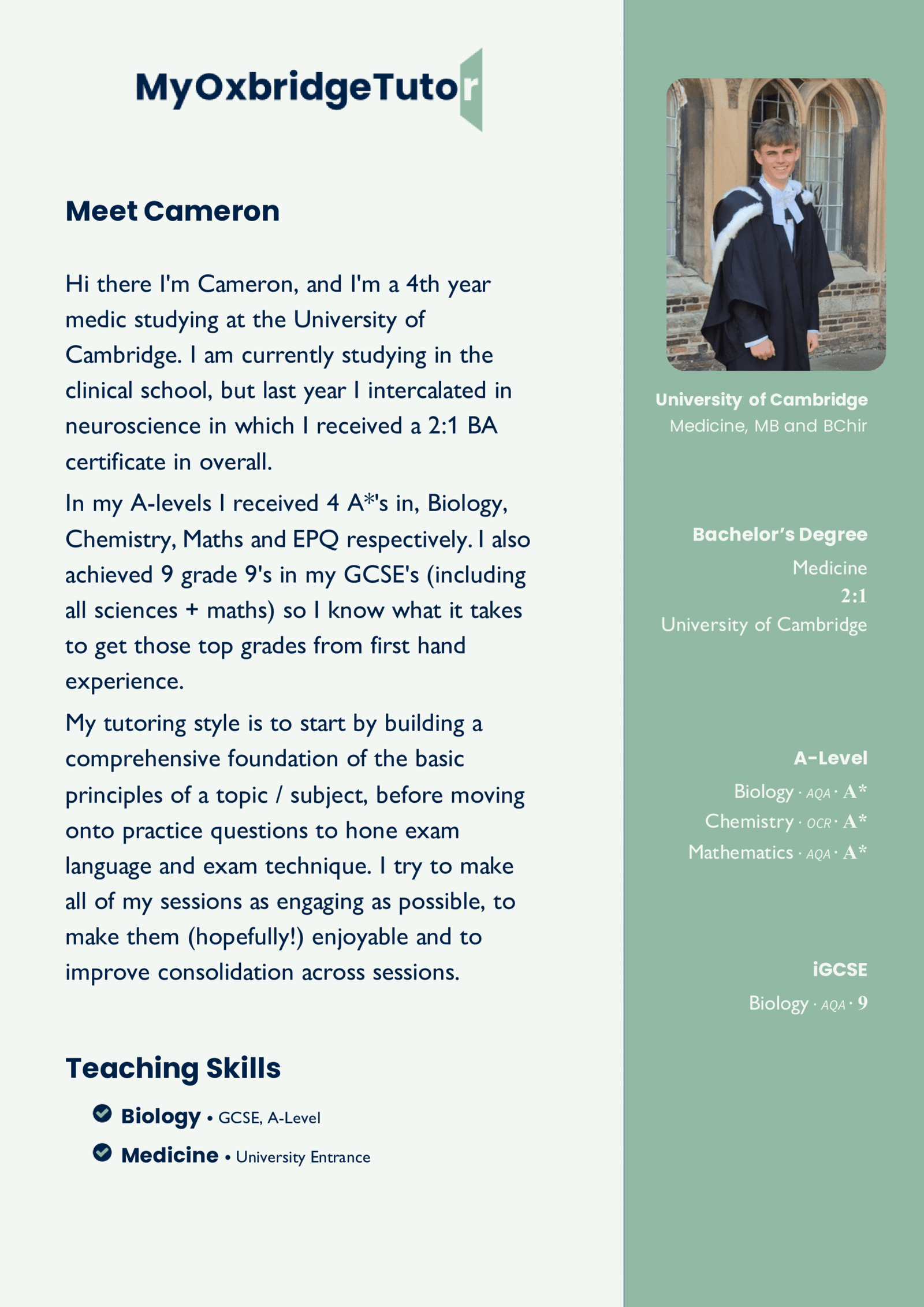 Looking for affordable, high-quality Biology tutoring? Our fixed-rate matching scheme connects you with skilled undergraduate tutors who excel in helping students achieve their goals. Each tutor’s profile includes their own GCSE and A-Level results, so you can select someone who understands the curriculum inside and out.
