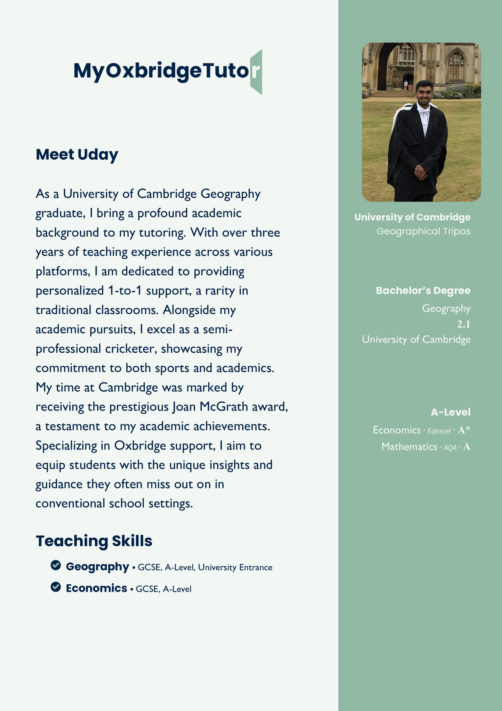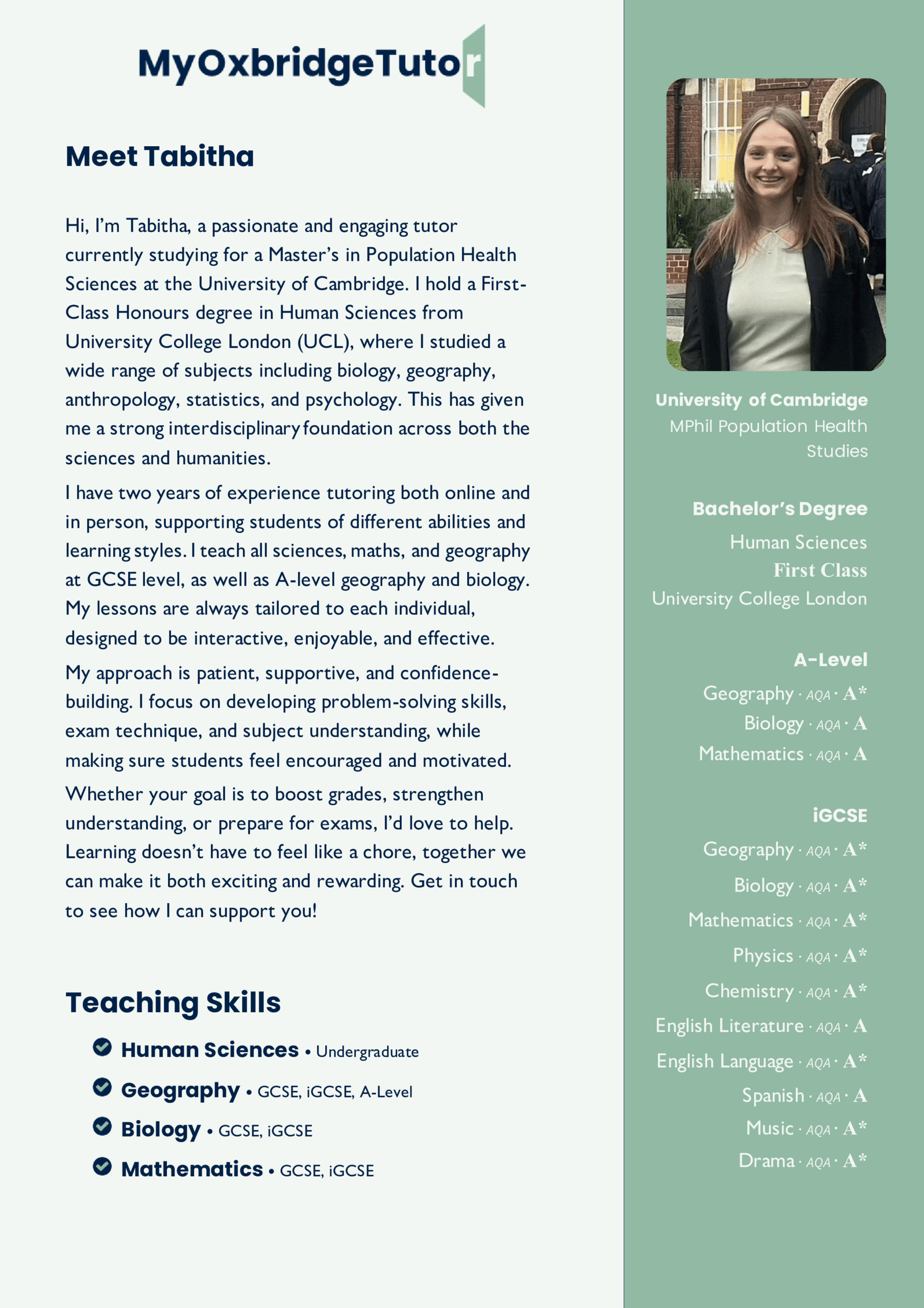 Looking for affordable, high-quality tutoring? Our fixed-rate matching scheme connects you with skilled tutors who excel in helping students achieve their goals. Each tutor’s profile includes their own GCSE and A-Level results, so you can select someone who understands the curriculum inside and out.